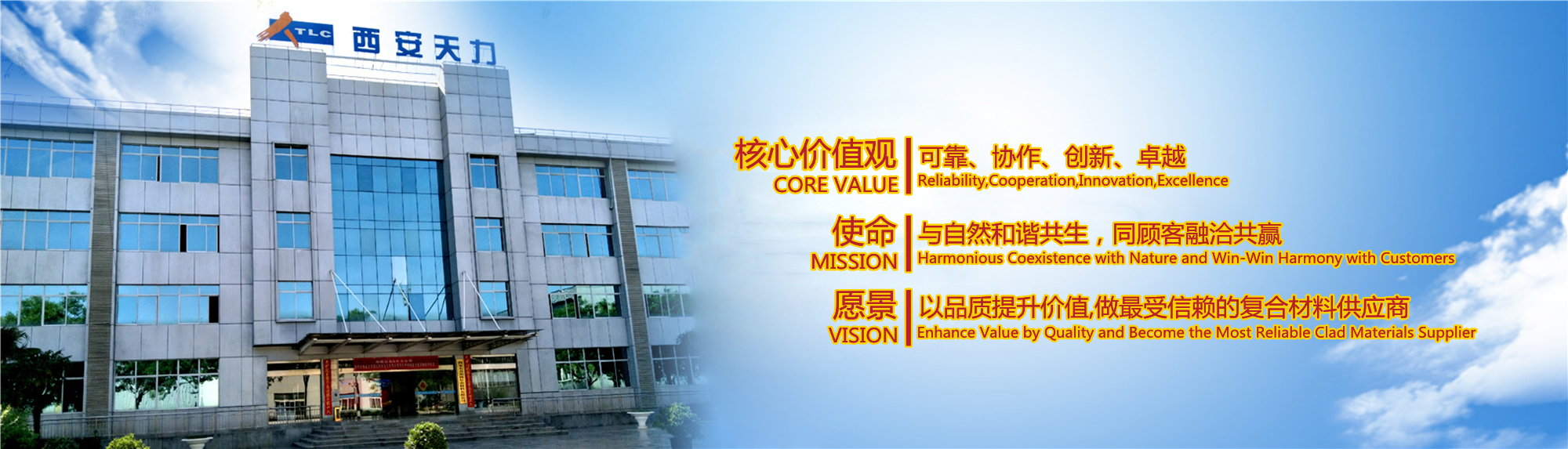 西安天力金屬復合材料股份有限公司是西北有色金屬研究院(集團)產業化上市公司“西部材料”控股的獨立法人公司,是專業從事層狀金屬復合材料研究及生產的高新技術企業,成立于2003年12月25日,位于西安經濟技術開發區涇渭工業園,注冊資本10895萬股,擁有生產廠房23000余平米,各類生產設備200余臺套及兩塊條件優越的爆炸復合場地,形成年產25000噸層狀復合材料的生產加工能力……